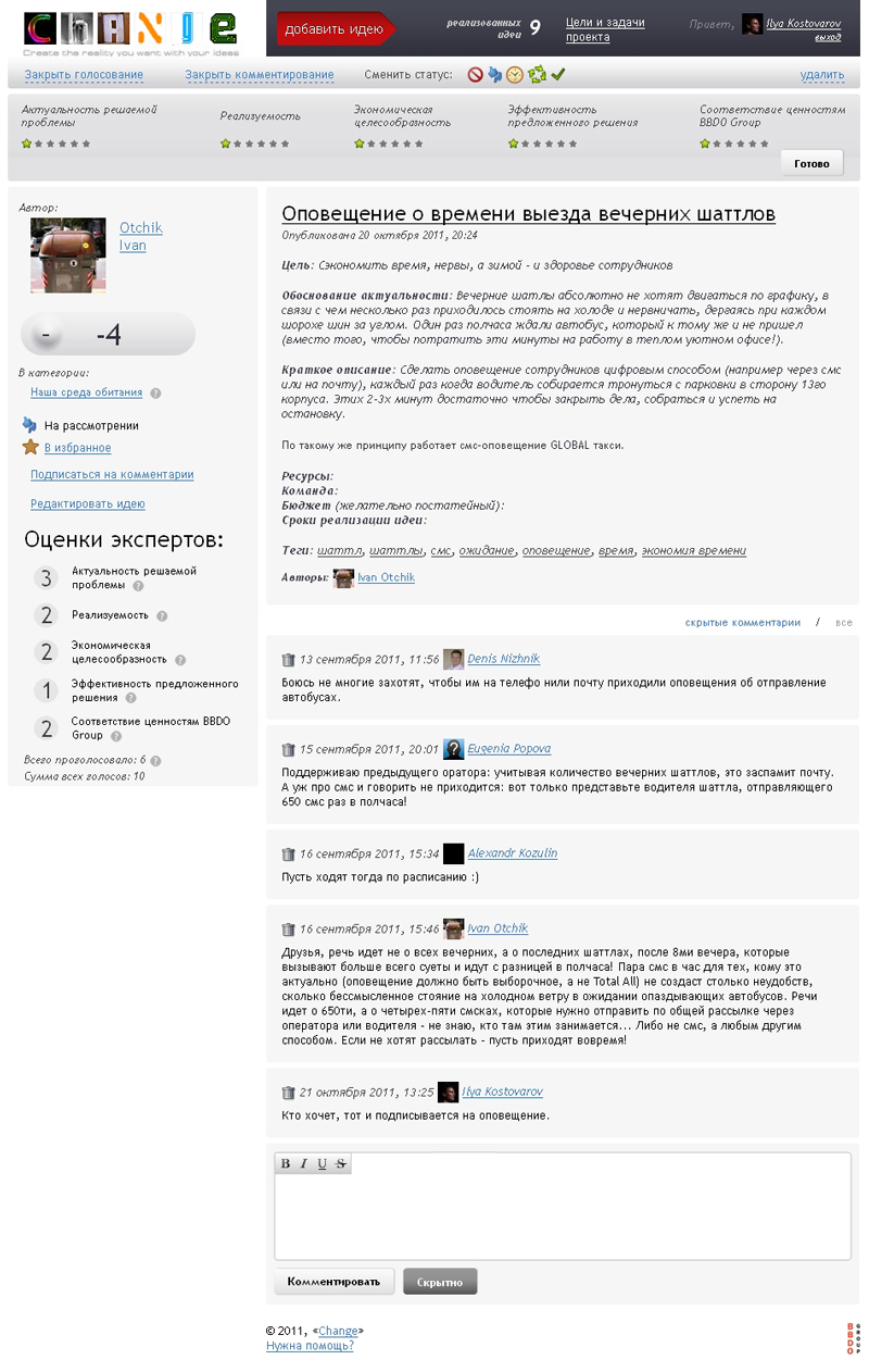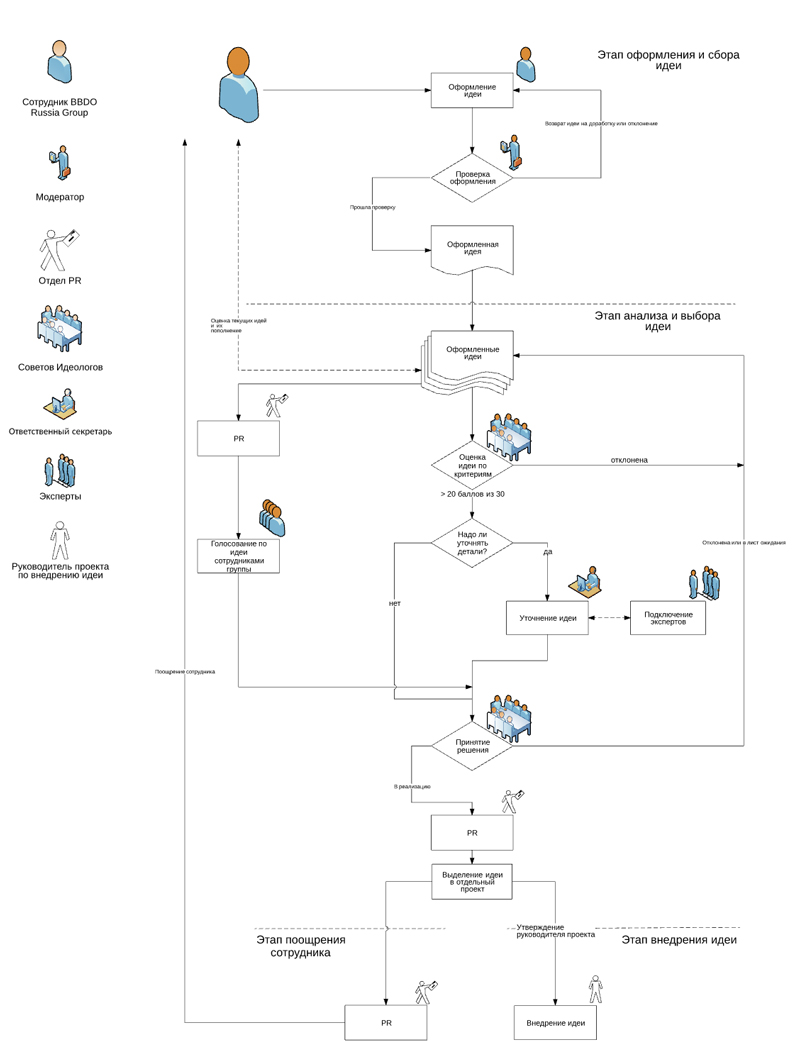 Внутренний проект для BBDO Group, направленный на управление идеями с оповещениями по внутренней почте. Процесс управления идеями проходит в несколько этапов: Оформление и сбор идей → Анализ и отбор → Внедрение → Поощрения сотрудника.